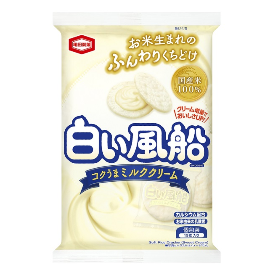 The White Balloon with Rich Milk Cream is a product that features a combination of smooth milk cream and crispy rice dough. Using Japanese rice, parents and children can enjoy it as a safe snack. The creamy flavor and gentle sweetness are one of the reasons why this product is loved by many.