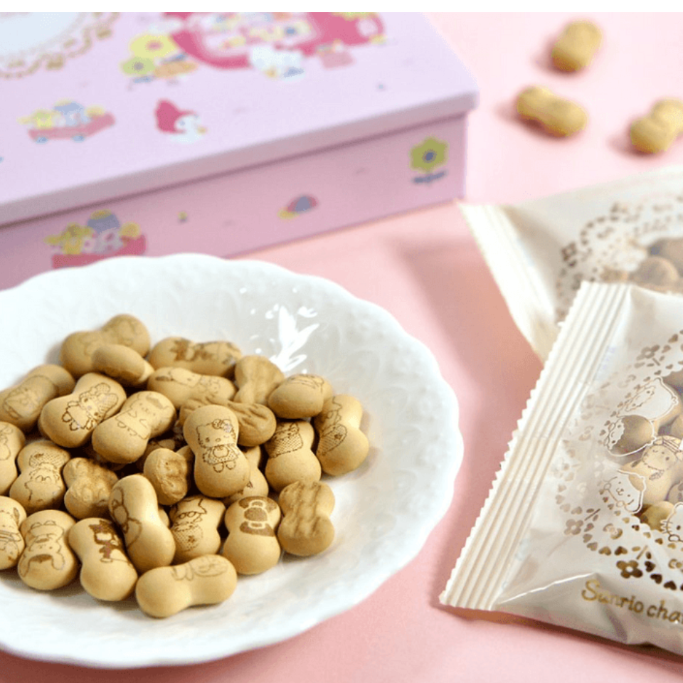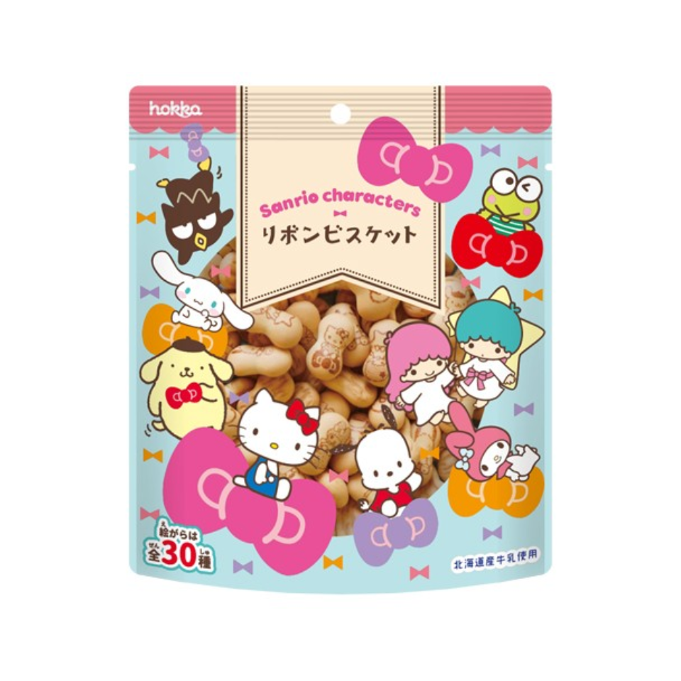 Sanrio Ribbon Cookies are cute ribbon-shaped cookies featuring popular Sanrio characters like Hello Kitty, My Melody, and Cinnamoroll. Made with milk from Hokkaido, these cookies have a smooth milk flavor and a crunchy texture. They're perfect as a snack for kids or with tea and come in a convenient stand-up pack. You can enjoy 30 different types of character prints on the cookies.