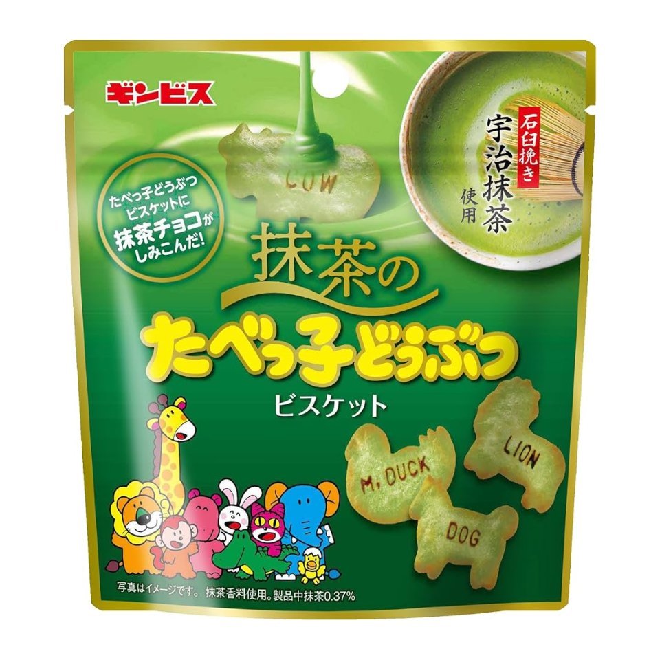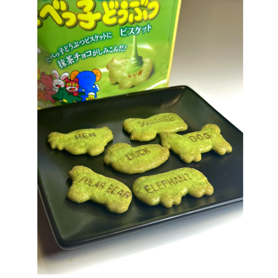 Below is a description of the product "Matcha Flavored Tabi Eko Animal Cookies" (抹茶のたべっ子どうぶつ) in English: