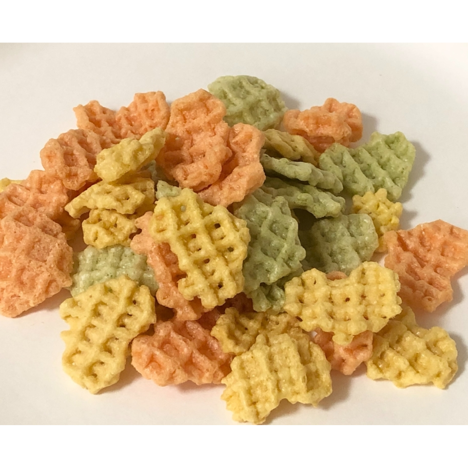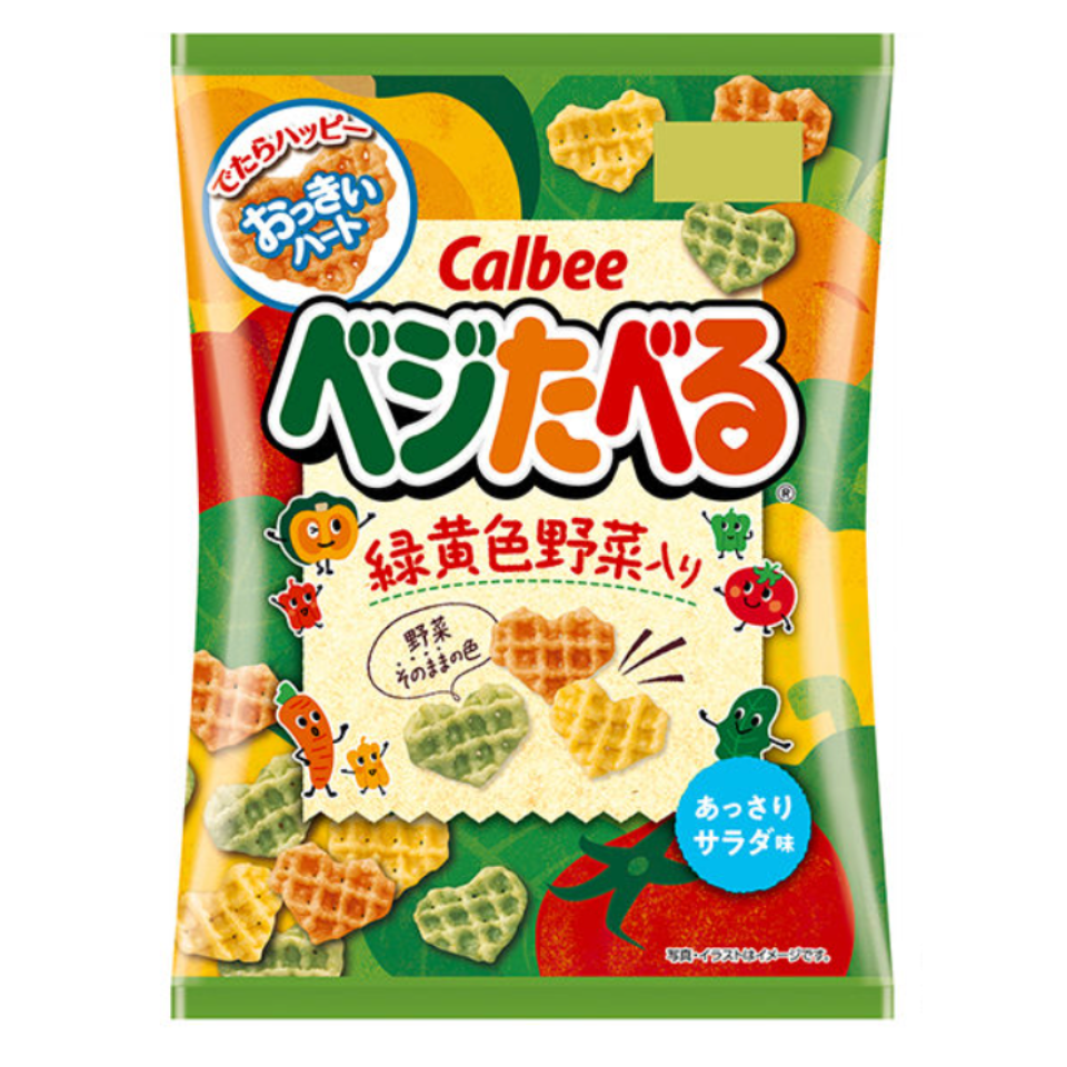 Calbee's Veggie Taberu (ベジたべる) is a heart-shaped snack that uses five types of yellow and green vegetables (spinach, pepper, squash, carrot, and tomato). It features three colors - green, yellow, and red - to reflect the colors and flavors of the different vegetables.