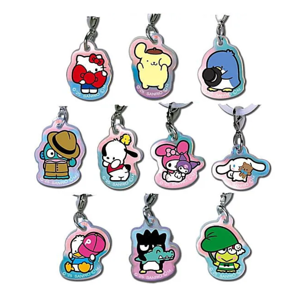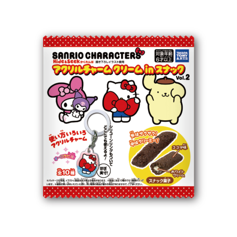 This unique set includes an acrylic charm designed with Sanrio characters with a European influence, as well as a crunchy snack made from cocoa dough and filled with white cream. There are 10 different types of charms, and each pack contains one charm, randomly selected along with the snack. Equipped with a silicone ring and clip, the charm can be attached to a bag or water bottle as a personal tag. The product is available at major Japanese retailers for approximately 396 yen.
