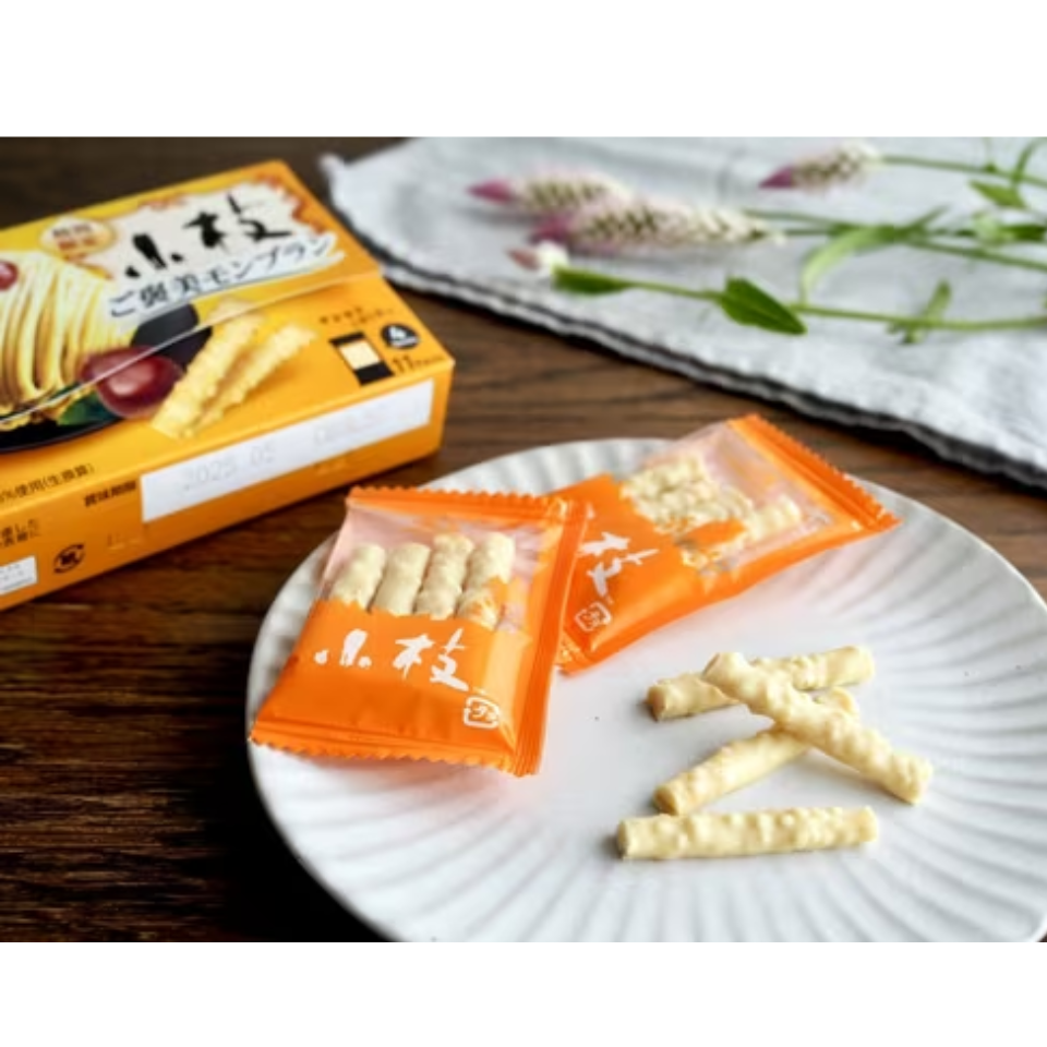 "Queda (with the rich taste of Montblanc)" is a stick-shaped chocolate candy infused with Italian chestnut powder, with an authentic Montblanc flavor and the subtle aroma of roasted chestnuts. Featuring biscuit crunch and wheat granules for a crisp, chewy texture, this crunchy candy is a luxurious choice for those seeking a rich, sophisticated taste.