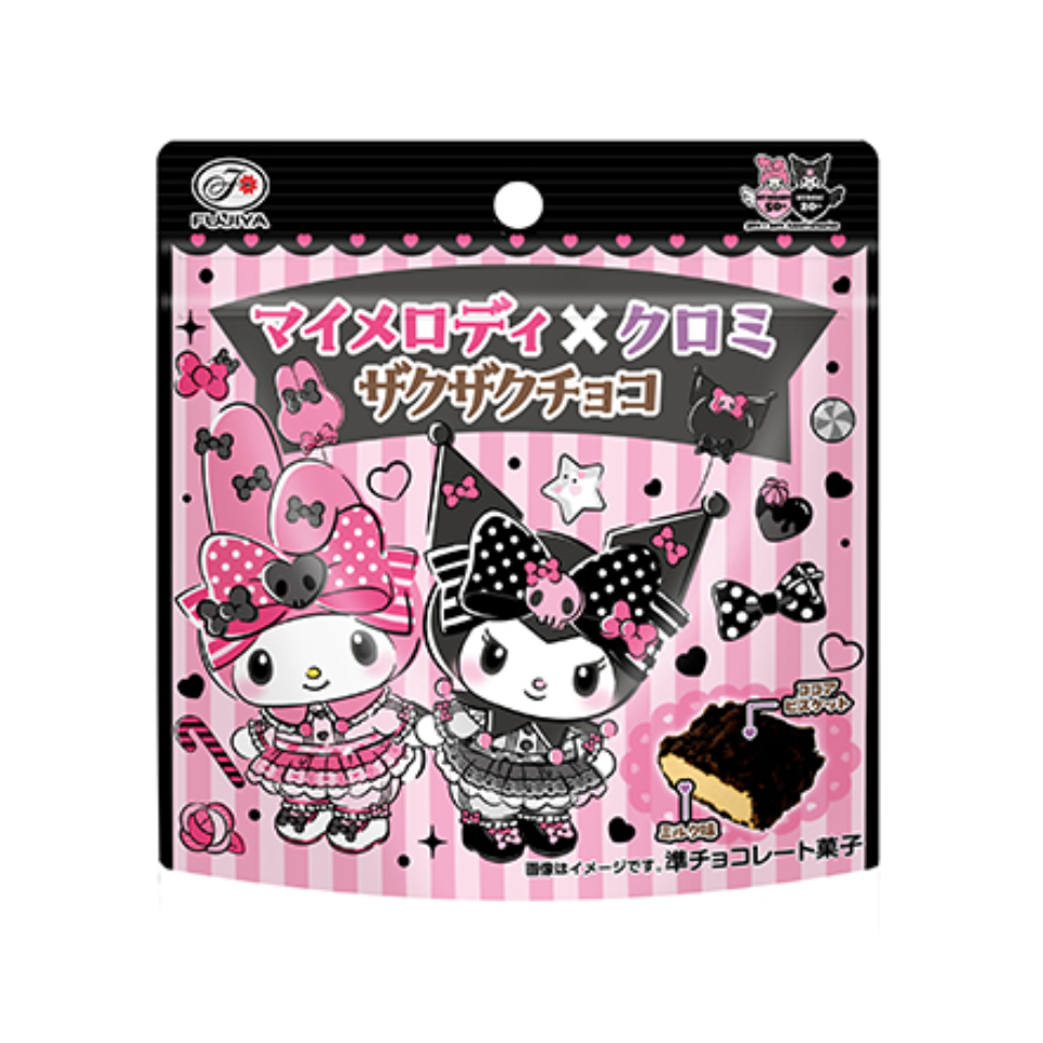 My Melody x Kuromi Crunchy Chocolate in a Bag is a limited-edition chocolate candy celebrating the 50th anniversary of My Melody and the 20th anniversary of Kuromi. This product features a cute and attractive packaging design. The chocolate inside has a milky flavor and a smooth texture that melts in the mouth, while the outer layer of dark cocoa biscuit provides a crunchy, robust feel. This snack combines two distinct textures in every bite, offering a delicious and enjoyable experience.