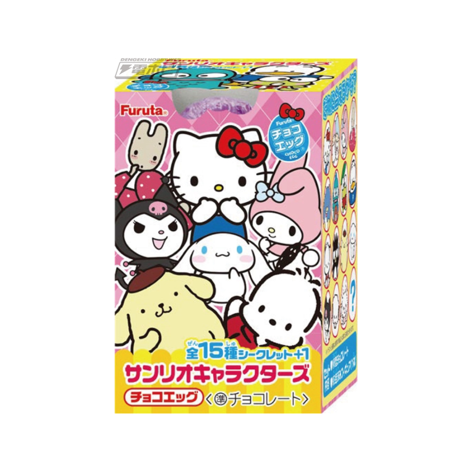Furuta's Choco Egg (Chocolate Egg) is a candy containing an egg-shaped chocolate enclosed in a small capsule. When opened, you find a miniature of a popular Sanrio character inside. The assortment includes 15 varieties plus one secret variety, including Hello Kitty, Cinnamoroll, Kuromi, Pochacco, and other beloved characters. You can't tell which character you'll get until you open the egg. These candies are sold at department stores, supermarkets, and select Sanrio stores across Japan.