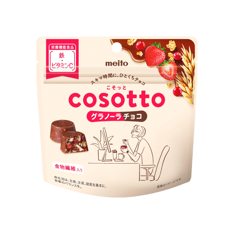 Cossuto Granola Choco is a single-bite chocolate bar containing granola, cranberries, and strawberries blended with chocolate. Featuring a refreshing berry flavor and a crunchy granola texture, it provides a feeling of fullness and satisfaction. One bag provides a third of your daily iron and vitamin C needs, plus fiber.