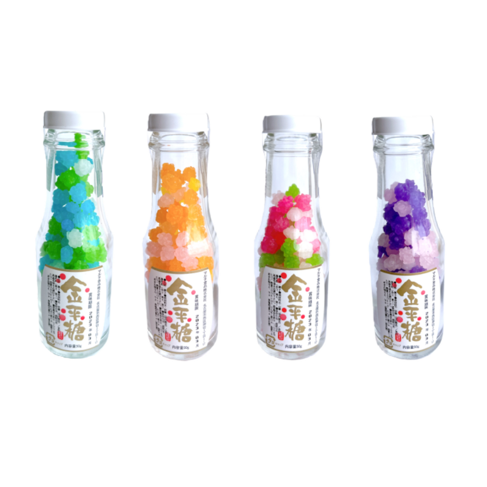 Maruta Shokuhin, "Konpeito in a Bottle," is a traditional Japanese sugar candy. It comes in a beautiful bottle and contains four colorful varieties (Sakura, Aji-sai, Fuji, and Cosmos). Its attractive appearance makes it an ideal gift or souvenir.