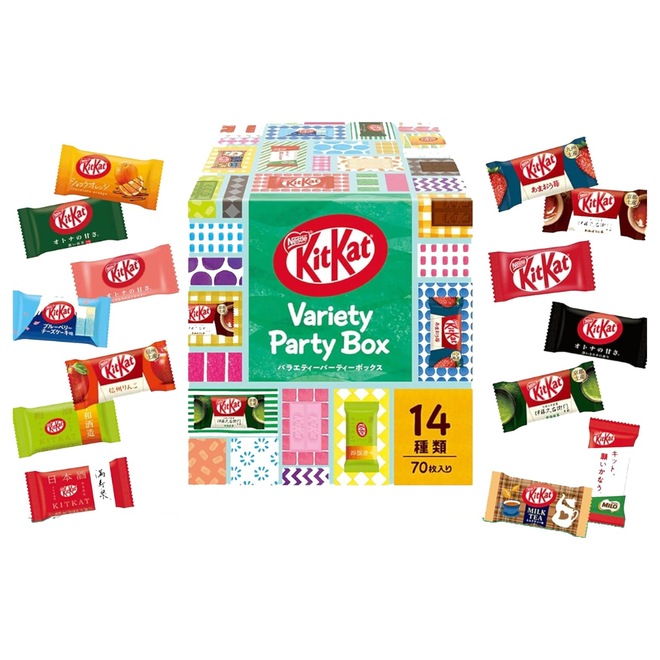 The Kit Kat Mini Party Box Variety Pack combines the beloved classic Kit Kat flavors with flavors specific to Japan's regions, offering a diverse and delicious experience in one box. It's perfect for parties, get-togethers with family or friends, and as a gift for end-of-year occasions. Each piece is individually wrapped with colorful and attractive designs, making choosing each flavor a pleasure. The pack contains several exclusive flavors that are usually difficult to find, making it the perfect gift to share and enjoy with everyone.