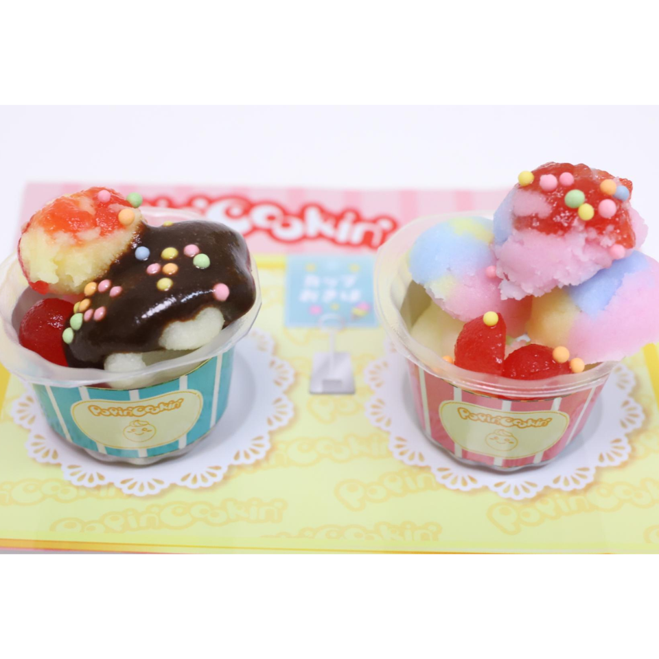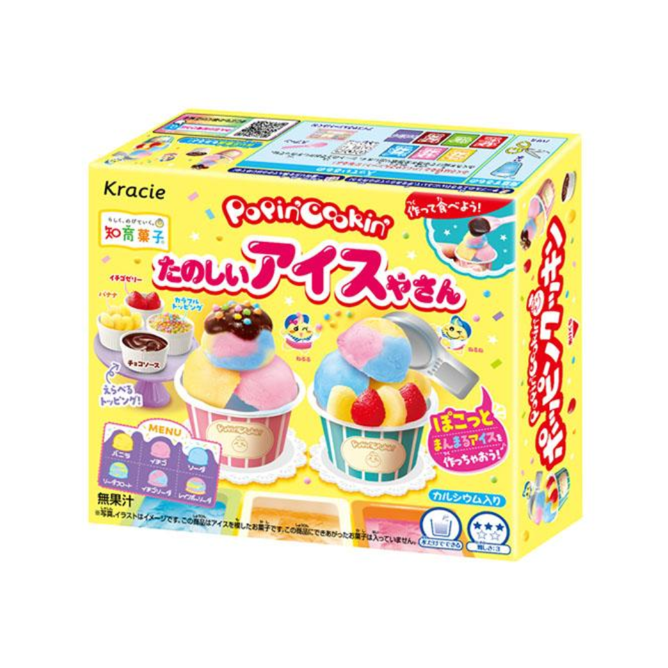 Poppin' Cookin' "Fun Ice Cream Shop" is an educational, DIY dessert that mimics real ice cream but doesn't melt. It's made using only water and powder. You can make three types of ice cream—vanilla, strawberry, and soda—and top them with strawberry jelly, bananas, chocolate sauce, colorful sprinkles, and more. All you have to do is mix the powder with water and form it, making it easy and fun even for young children. The end result looks and tastes just like real ice cream, and you can have fun playing the part of an ice cream shop owner or creating your own flavors.