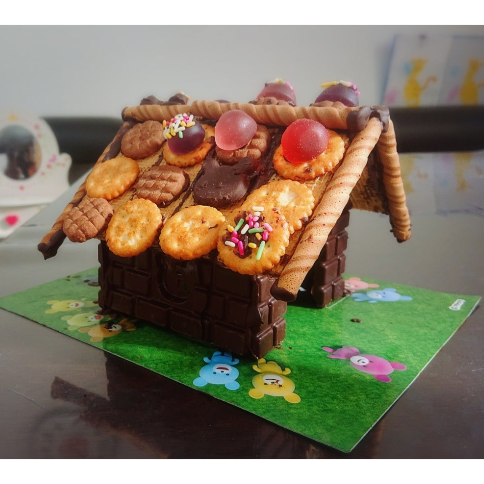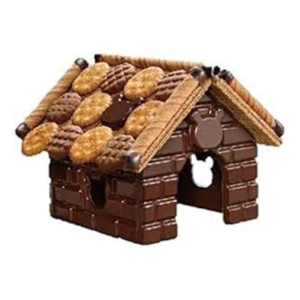 تُذاب الشوكولاتة شبه الصلبة في الميكروويف، ثم تُجمع الوافل أو الكراكر كجدران وسقف لبناء منزل أصلي.