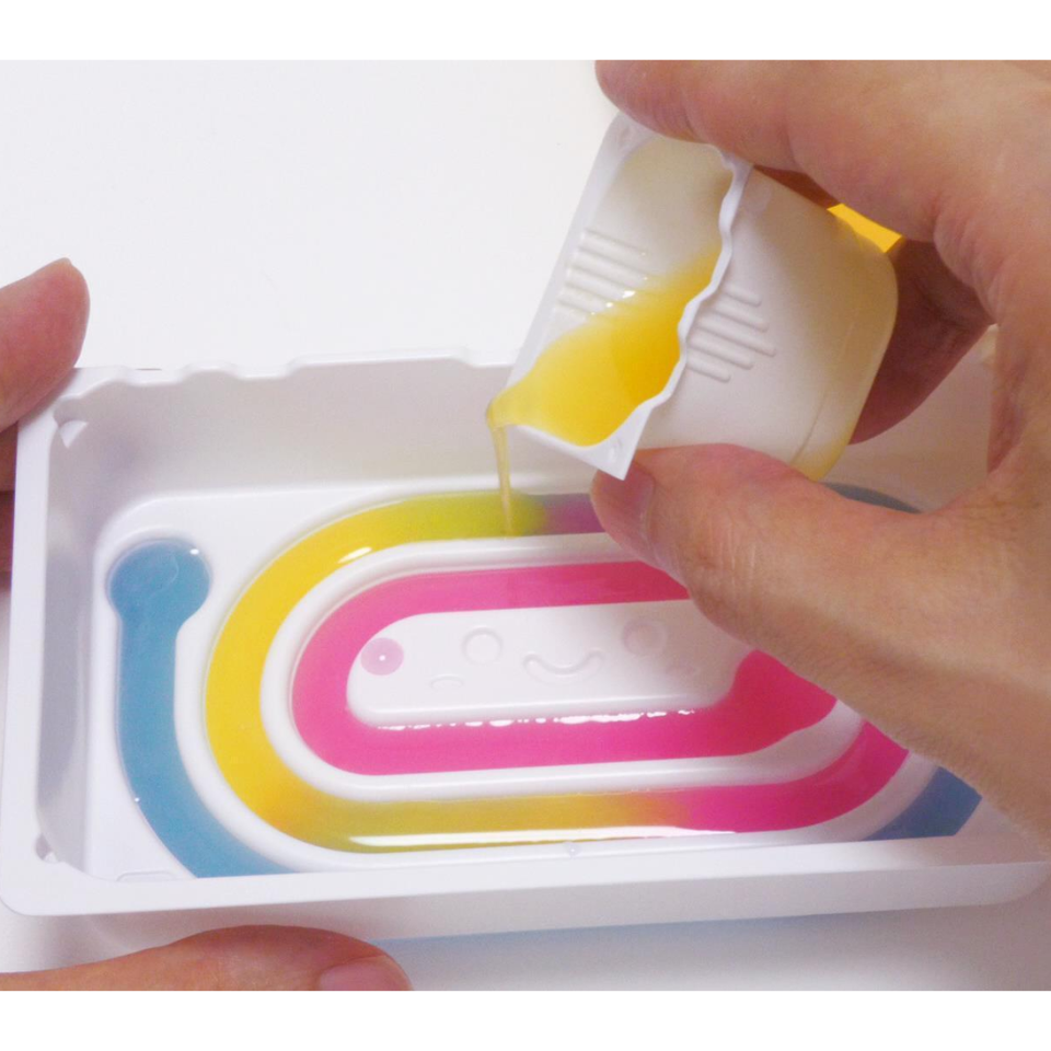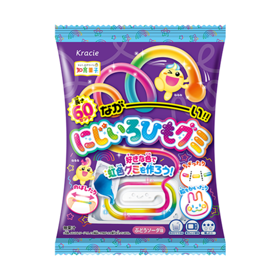 يتميز بصبغ الجيلي السائل ثلاثة ألوان في الصينية، ثم تسخينه في الميكروويف وبعدها تبريده لاستخراجه، مما ينتج غومي قوس قزح طويل فريد من نوعه.