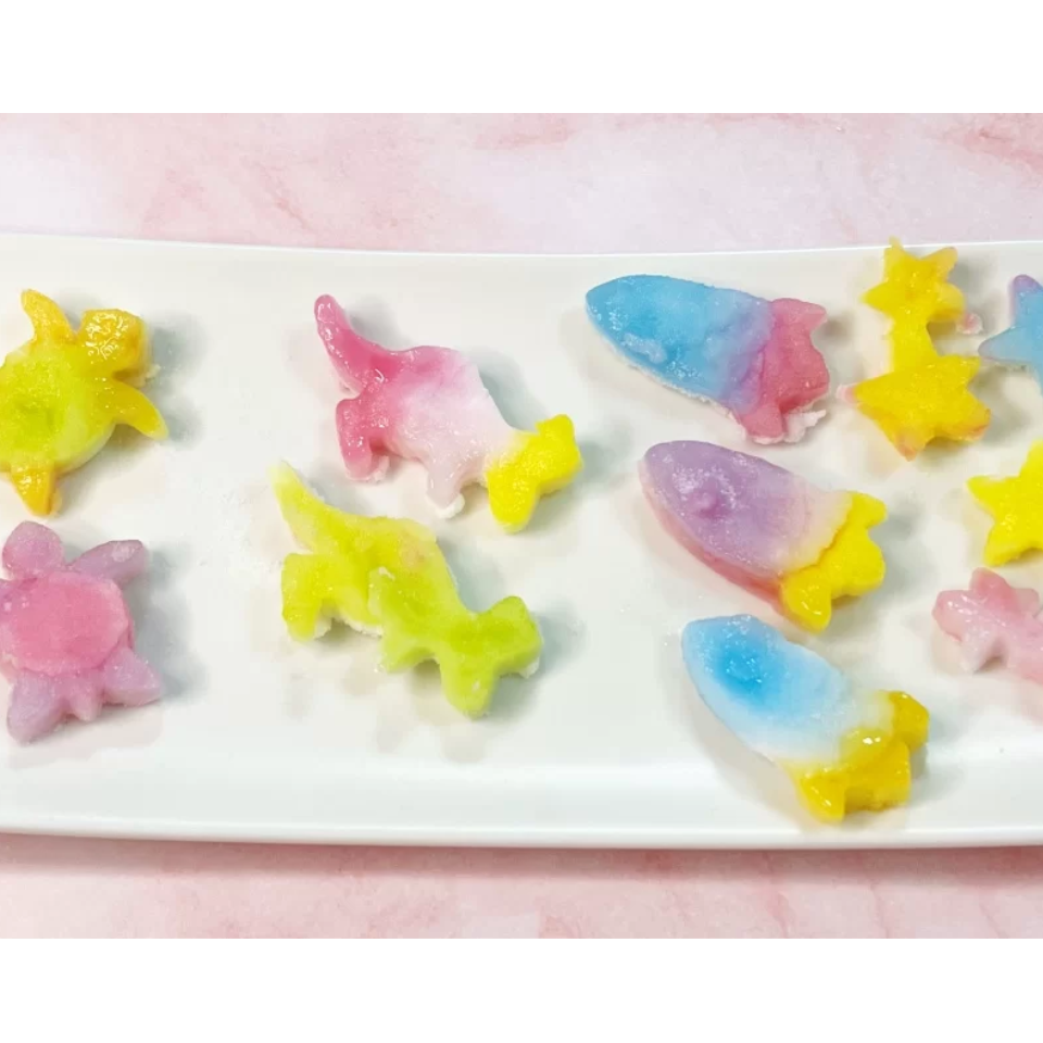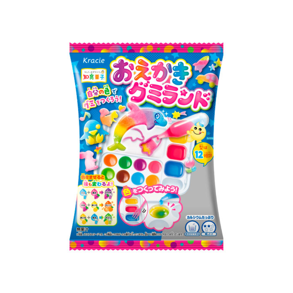 رسم جزيرة جومي Oekaki Gumiland هي حلوى تعليمية تتيح لك صنع حلوى جيلي ملونة بأشكال وألوان فريدة باستخدام ثلاث ألوان أساسية: الأحمر والأزرق والأصفر. ما عليك سوى مزج الألوان أو صبها في قوالب لتصنع بسهولة حلوى جيلي أصلية ذات قوام مطاطي لذيذ. يتم تضمين أحد أنواع قوالب الجيلي الاثني عشر بشكل عشوائي، مما يتيح لك الاستمتاع بصنع الحلوى وتجربة فنية في آن واحد. غنية بالكالسيوم وخالية من الألوان الصناعية والمواد الحافظة.