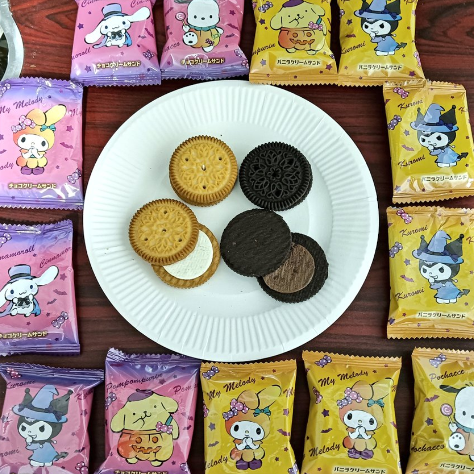 يقدم منتج البسكويت المحشو بالكريمة من سانريو مجموعة من البسكويت المقرمش بطبقتين من كريمة الفانيلا وكريمة الشوكولاتة، مزين بأغلفة فردية عليها رسومات ستة من أشهر شخصيات سانريو. يناسب هذا المنتج حفلات الهالووين أو حفلات الأعياد ويتميز بحجم صغير وشكل لطيف يجمع بين الطعم الجميل والشكل المرح.