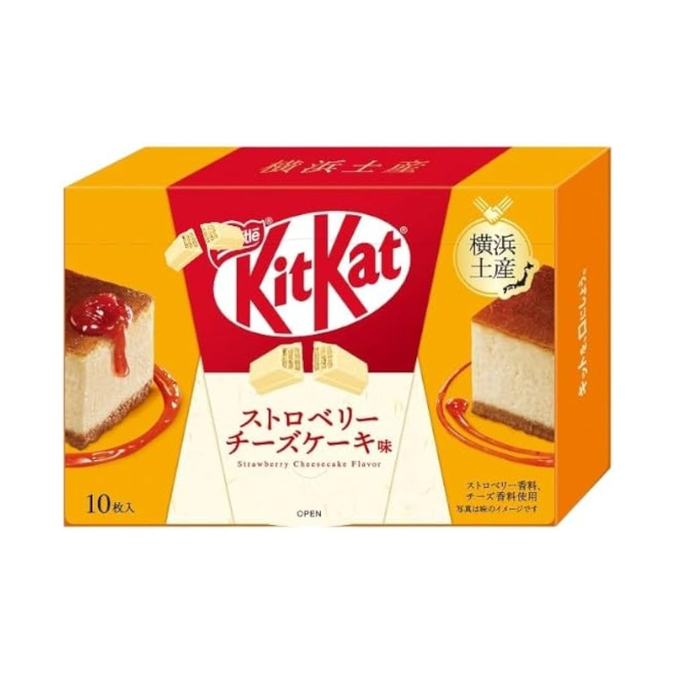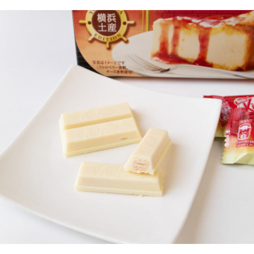 كيت كات بالنكهة الخاصة بمدينة يوكوهاما: حشوة كريمة بالجبن داخل ويفر مقرمش، مغطى بشوكولاتة بيضاء بنكهة جبنة الفراولة الراقية والمميزة لمدينة الميناء.