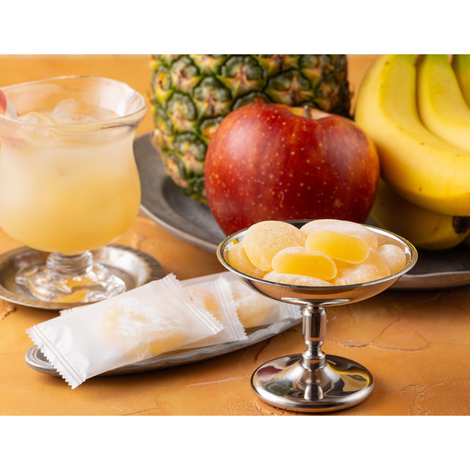 شراب النشا (إنتاج محلي)، سكر، دقيق الأرز اللزج، نشا، عصير برتقال ماندرين، هريس/مستحلب الموز، توابل، تلوين (كاروتين)، (يحتوي على مكونات الحليب والموز جزئيا)