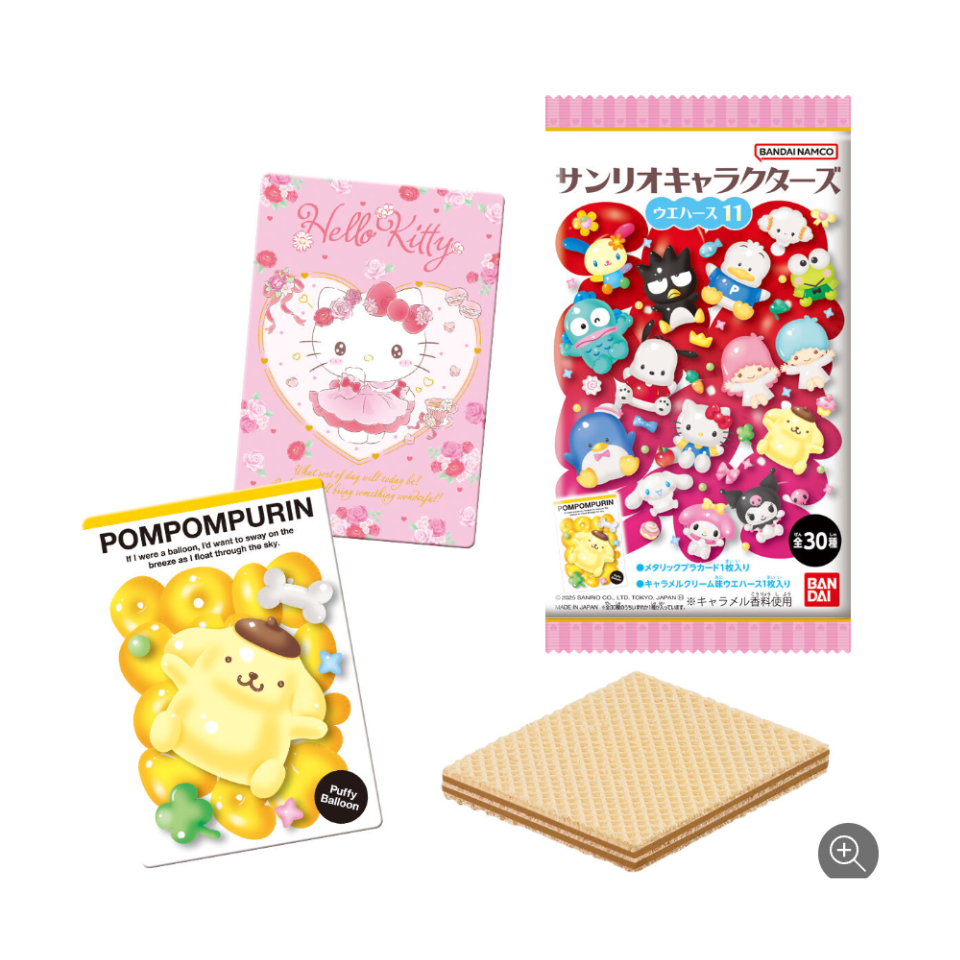 وايفرز سانريو تشاراكتيرز 11، الجولة 11 من سلسلة الطعام الترفيهي الشهيرة من بانداي، يحتوي على وايفر بنكهة كراميل كريم مع بطاقات معدنية مزدوجة الوجه (30 نوعاً عشوائياً). تصاميم بالون منتفخة ووقت الشاي بالزهور مع بطاقات خاصة مطلية بورق الذهب، صدر في 15 ديسمبر 2025 .