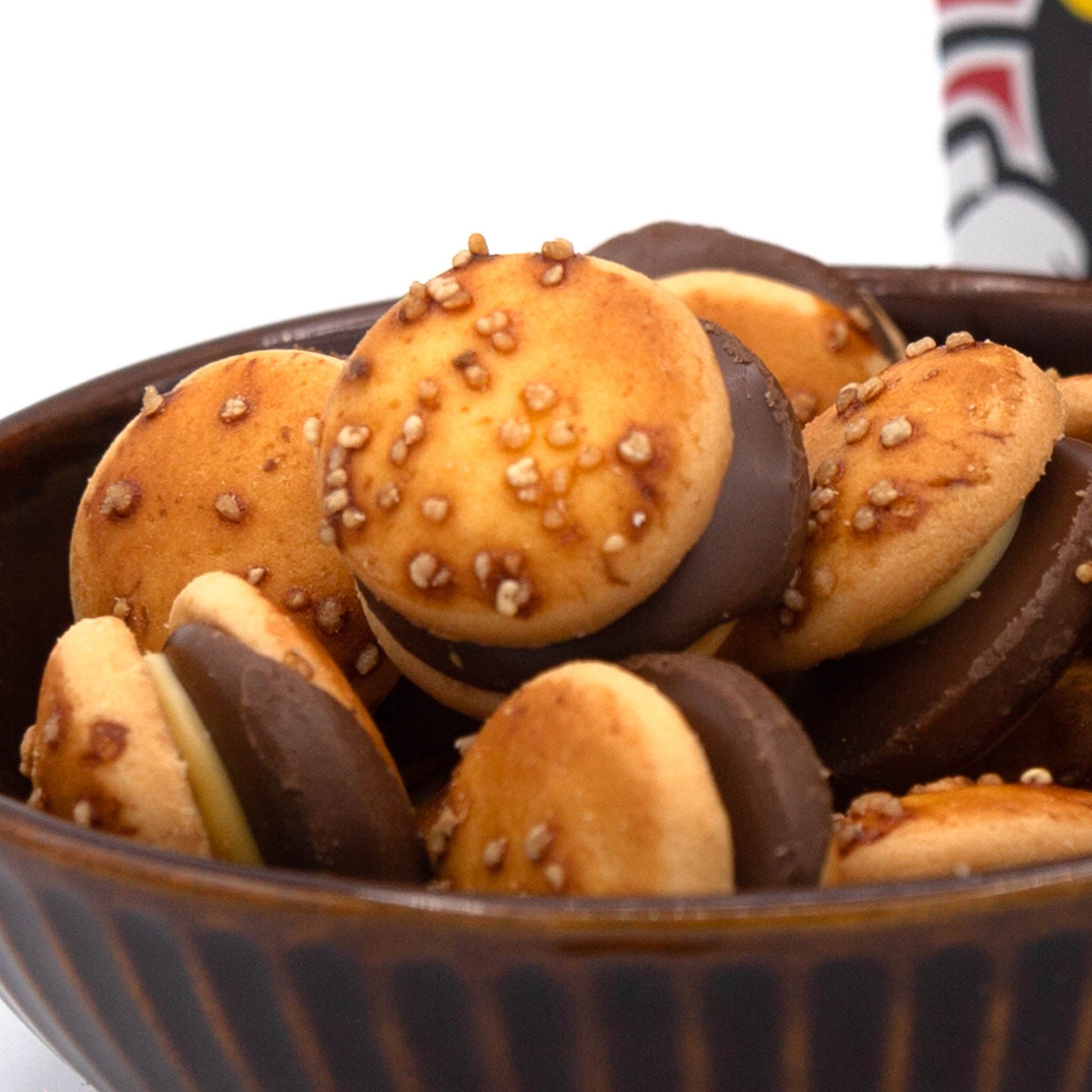 - البسكويت مغطى بالسمسم (حاليًا حبوب الدخن المنتفخة) لإضفاء نكهة محمصة